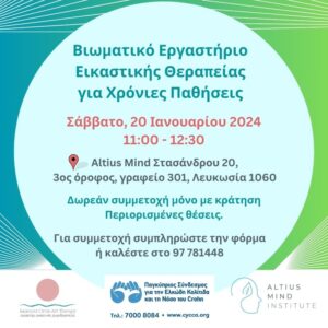 Το Altius Mind Institute σε συνεργασία με την Σαββίνα Ιωάννου (Εγγεγραμμένη Ψυχοθεραπεύτρια (CRPO-Q), Εικαστική Θεραπεύτρια και Εικαστικός) και τον Παγκύπριο Σύνδεσμο για την Ελκώδη Κολίτιδα και τη Νόσο του Crohn (ΠΑ.ΣY.Ε.Κ.Κ) διοργανώνει δωρεάν βιωματικό εργαστήριο Εικαστικής Θεραπείας.
