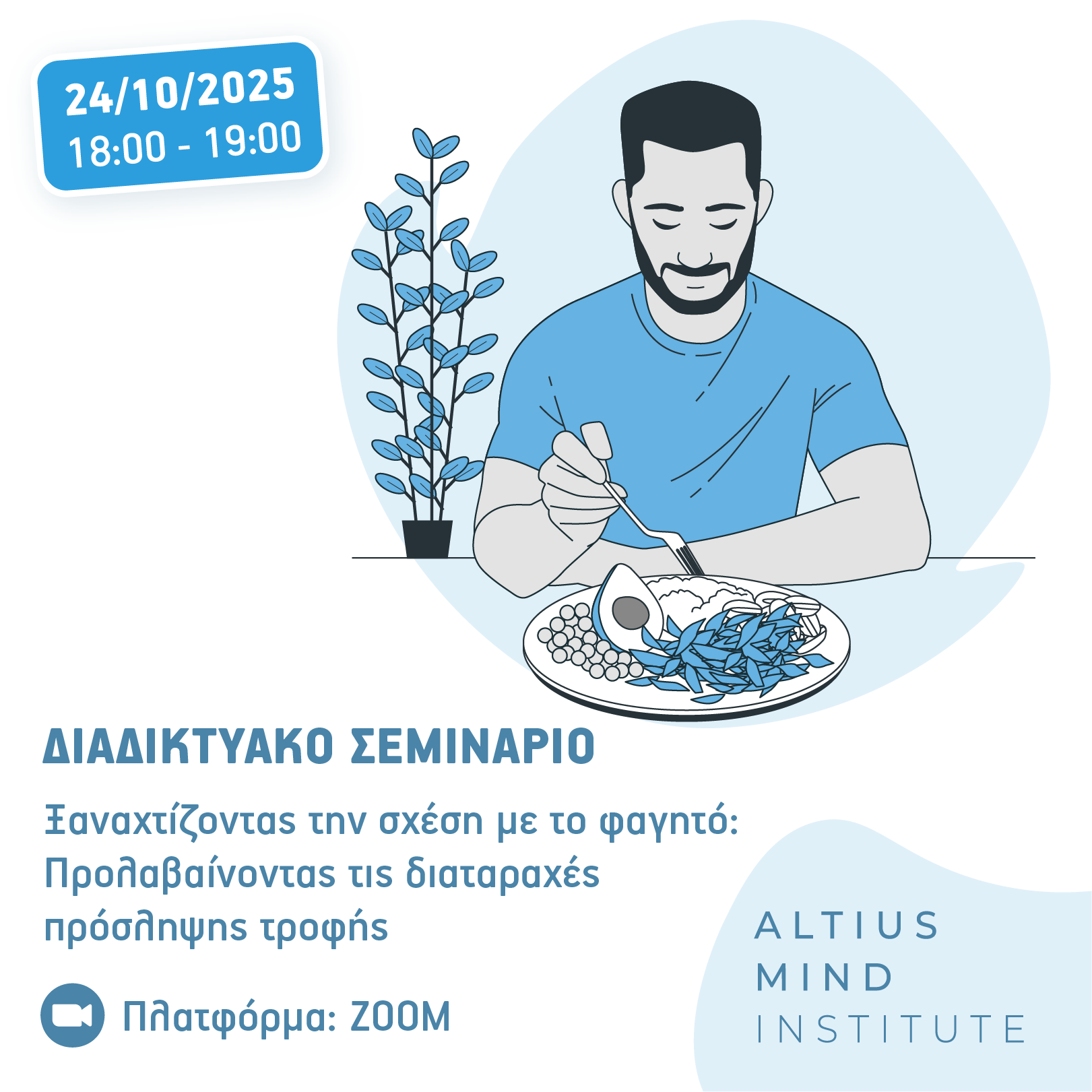Το παρόν διαδικτυακό σεμινάριο συζητά συμπεριφορές που συχνά ταλαιπωρούν άτομα με δυσκολίες στη σχέση τους με το φαγητό, όπως είναι το μέτρημα θερμίδων, η πρόκληση εμετού, η επίμονη φυσική άσκηση, η αποφυγή συγκεκριμένων φαγητών ή ομάδων φαγητών κτλ. Ο σκοπός του σεμιναρίου είναι η πρόληψη ή η γρήγορη παρέμβαση σε αυτές τις συμπεριφορές μέσω α) της κατανόησης των συμπεριφορών και της σύνδεσης τους με σκέψεις και συναισθήματα και β) της εκμάθησης συγκεκριμένων τεχνικών διαχείρισης τους.
